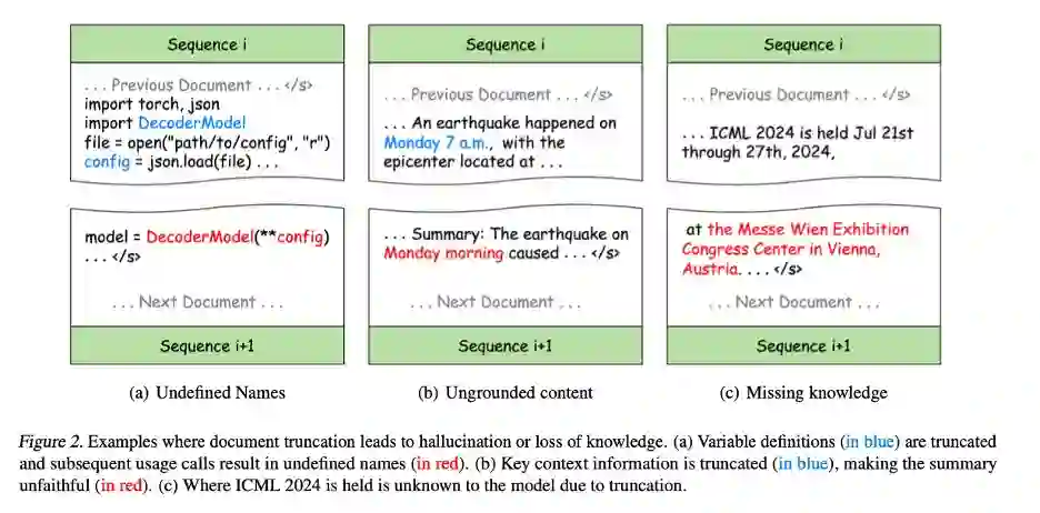 **在传统的大型语言模型训练方法中,为了提高效率,研究人员通常会将多个输入文档拼接在一起,然后将这些拼接的文档分割成固定长度的序列。 这种方法虽然简单高效,但它会造成一个重大问题——文档截断(document truncation),损害了数据完整性(data integrity)。文档截断会导致文档包含的信息丢失 (loss of information)。 此外,文档截断减少了每个序列中的上下文量,可能导致下一个词的预测与上文不相关,从而使模型更容易产生幻觉 (hallucination)。 以下的例子展示了文档截断带来的问题: