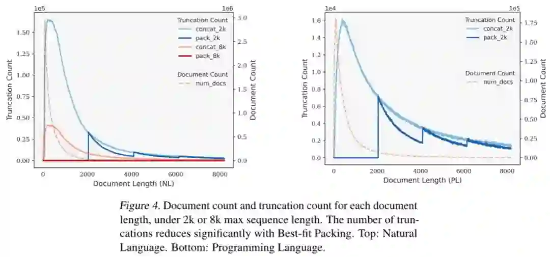 图4:当最大序列长度设置为2k或8k时,在不同文档长度下,每个文档长度对应的文档数量和截断数量。使用“最佳适应打包”(Best-fit Packing)技术后,截断数量明显减少。上方:自然语言。下方:编程语言。 实验与结果