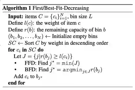 针对这一问题,研究者提出了最佳适配打包 (Best-fit Packing)。 该方法使用长度感知的组合优化技术,有效地将文档打包到训练序列中,从而完全消除不必要的截断。这不仅保持了传统方法的训练效率,而且通过减少数据的片段化,实质性地提高了模型训练的质量。 作者首先先将每个文本分割成一或多个至多长为模型上下文长度L的序列。这一步限制来自于模型,所以是必须进行的。 现在,基于大量的至多长为L的文件块,研究者希望将它们合理地组合,并获得尽量少的训练序列。这个问题可以被看作一个集装优化(Bin Packing)问题。集装优化问题是NP-hard的。如下图算法所示,这里他们采用了最佳适配递减算法(Best-Fit-Decreasing, BFD) 的启发式策略。 接下来从时间复杂度 (Time Complexity) 和紧凑性 (Compactness) 的角度来讨论BFD的可行性。