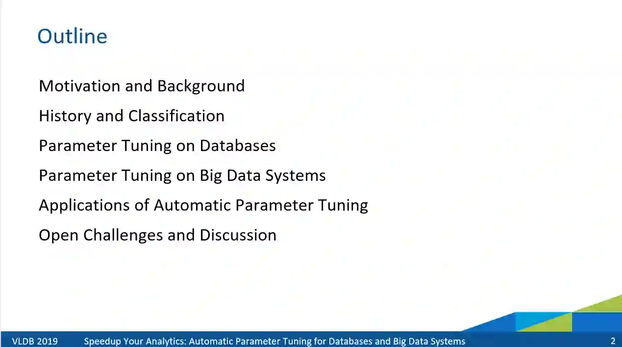 简介: Hadoop和Spark等数据库和大数据分析系统具有大量配置参数,这些参数控制着内存分配,I / O优化,并行性和压缩。 不正确的参数设置会导致严重的性能下降和稳定性问题。 但是,普通用户甚至专家管理员都难以理解和调整他们以取得良好的性能。 在本教程中,我们回顾了有关数据库,Hadoop和Spark的自动参数调整的现有方法,我们将其分为六类:基于规则,成本模型,基于模拟,实验驱动,机器学习和自适应调整。 我们描述了不同的自动参数调整算法的基础,并介绍了每种方法的优缺点。