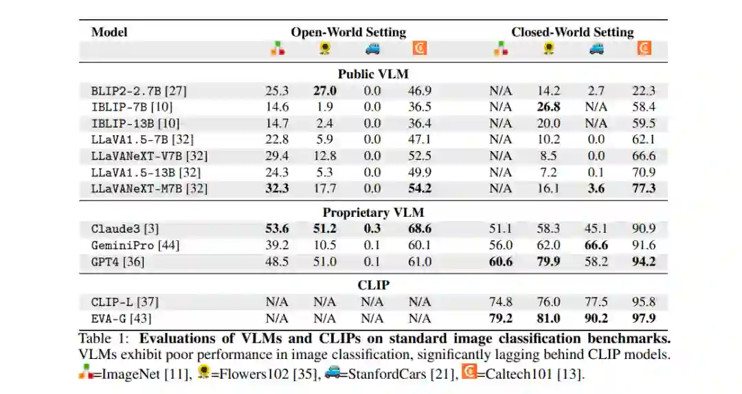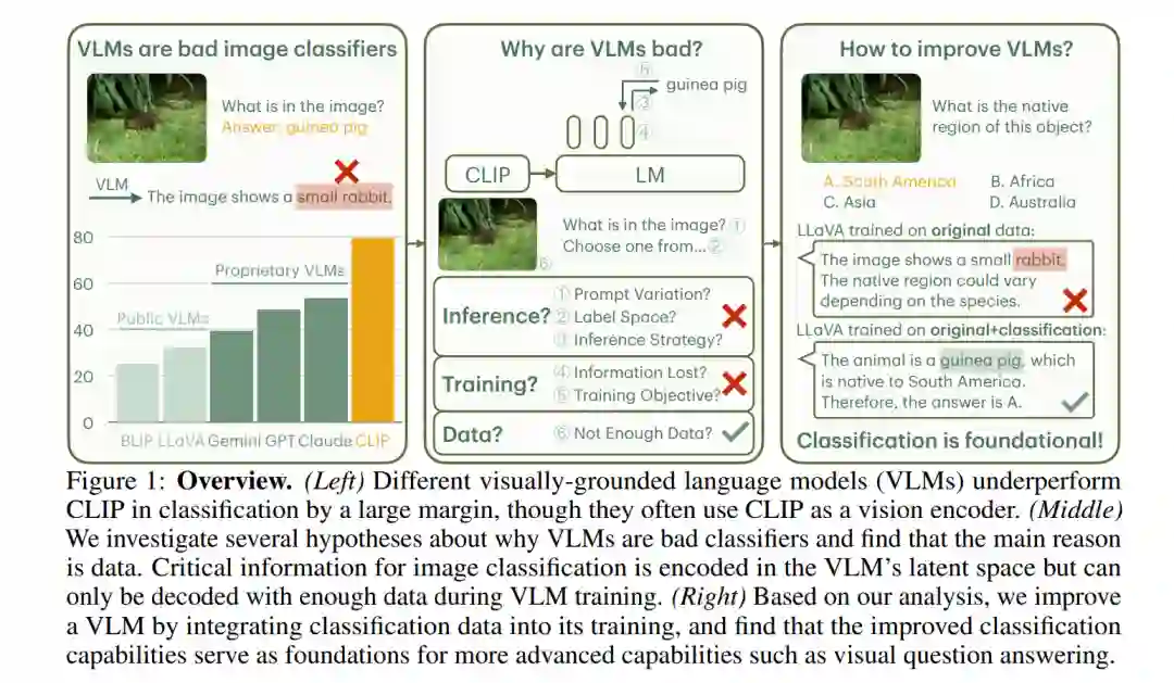 在这项工作中,我们重新审视了使用VLM进行图像分类的基本任务。令人惊讶的是,我们发现各种公开和专有的VLM在图像分类任务上存在困难,无论是在开放世界设置(类别列表未知)还是封闭世界设置(提供了类别名称的上下文)中 (§2)。尽管VLM的参数远多于CLIP,但它们在标准图像分类任务上的表现明显逊色。我们的评估协议是将每个图像和类别名称列表(在封闭世界设置中)作为上下文输入给VLM,并询问图像中的内容;成功的定义是生成的输出是否包含真实类别名称。 为了理解为什么VLM在分类任务中的表现不佳,我们调查了关于VLM推理(如提示变化、标签集大小、推理策略;§3.1)、训练(如信息丢失、训练目标;§3.2)和数据(如数据与性能的相关性;§3.3)等方面的几个假设。我们的广泛分析表明,观察到的性能差距主要是由于数据相关。我们发现,图像分类所需的信息被编码在VLM的潜在空间中,但只有通过正确的训练数据才能有效解码。具体而言,VLM训练过程中类别的曝光频率与VLM在这些类别上的表现之间存在强相关性。此外,使用分类数据集对VLM进行训练,可以实现与最先进的分类模型相同的性能水平。 基于我们的分析,我们提出了一种简单的方法,通过将传统的分类数据集整合到VLM训练中,来增强VLM的通用能力 (§4)。我们认为,分类是更复杂、更高级的视觉能力的基础;例如,识别物体是回答关于该物体复杂问题的前提。为了验证这一点,我们创建了ImageWikiQA,它包含关于ImageNet物体的复杂现实问题。在ImageWikiQA上,我们发现,经过ImageNet分类数据集微调的VLM在识别这些物体时取得了显著更高的准确率,并能够更准确地回答这些非分类问题,超越了预训练的VLMs,提升了11.8%。这表明,经典的分类数据可以有益地重新用于VLM的训练过程,从而提升VLM的性能。 总结我们的贡献: