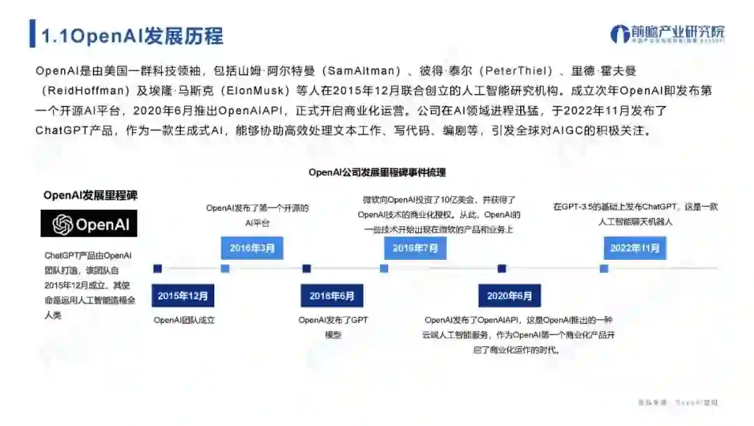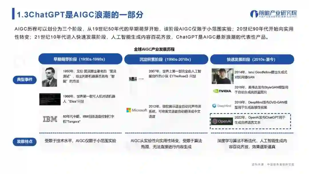 ChatGPT带动AIGC风靡全球,成为2023年最强产业风口。 ChatGPT具备划时代的强大功能,一经发布短短5天便获得100万用户,此前全球顶流社交软件INS触及100万用户花费了2.5个月时间。其后,仅上线两月ChatGPT就获得1亿月度活跃用户,成为历史上增长最快的面向消费者的应用。 而ChatGPT爆火的背后,是汹涌而来的AIGC浪潮! 作为AIGC最新浪潮的代表性作品,ChatGPT引发了全球资本市场对AIGC前所未有的投资热潮。Deelroom数据显示,2023年1月全球生成式AI总估值达到480亿美元,相比2020年底增长了6倍。其中OpenAI估值达到290亿美元,相比2021年增长超1倍。 ChatGPT以及AIGC背后蕴藏的巨大商机,迅速掀起了全球各大科技企业抢滩布局的热潮。这不仅将加速新一轮科技变革的步伐,而且带来的将是全行业的彻底颠覆,所有的企业或将被洗牌,所有的商业模式可能被改写。 为了更好洞察产业机遇、把脉市场风向,近日,前瞻产业研究院重磅发布了《ChatGPT开启AIGC产业生态新时代》(以下简称《报告》),旨在提供对人工智能以及AIGC产业发展情况概述,主要包括新风口、新生态、新变革、新机遇等进行前瞻性判断和分析,以下为《报告》的一些节选内容: (一)AIGC产业链市场规模将突破万亿