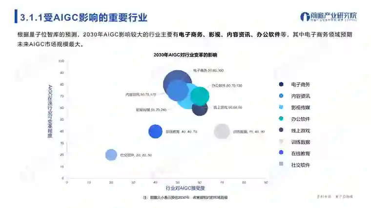 《报告》显示,2030年受AIGC影响较大的行业主要有电子商务、影视、内容资讯、办公软件等,其中电子商务领域预计未来AIGC市场规模最大。
