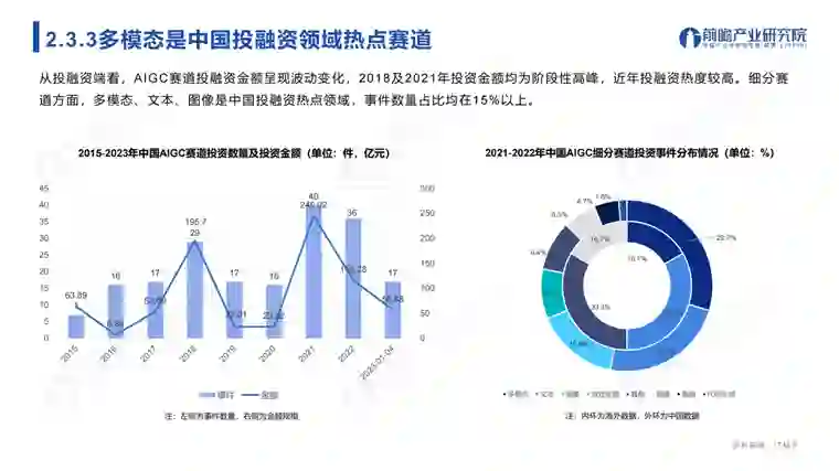 其中,在AIGC领域,多模态是中国投融资领域热点赛道,图像、视频预计成为高潜领域。 《报告》指出,从投融资端看,AIGC赛道投融资金金额呈现波动变化,2018及2021年投资金额均为阶段性高峰,近年投融资热度较高。细分赛道方面,多模态、文本、图像是中国投融资热点领域,事件数量占比均在15%以上。
