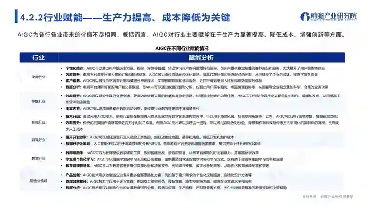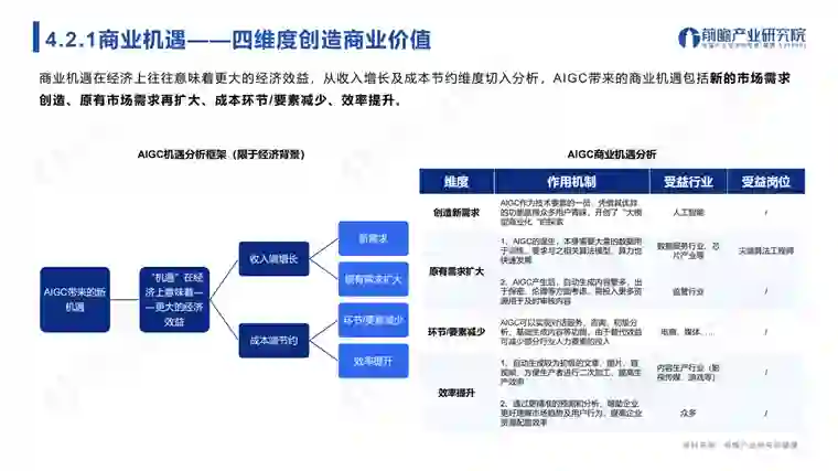 《报告》指出,商业机遇在经济上往往意味着更大的经济效益,从收入增长及成本节约维度切入分析,AIGC带来的商业机遇包括新的市场需求创造、原有市场需求再扩大、成本环节**/要素减少、效率提升**。