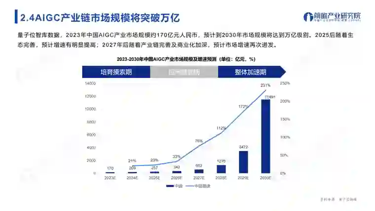 《报告》显示,2023年中国AIGC产业规模约170亿元人民币,预计到2030年市场规模将达到万亿级别。2025年后随着生态完善,预计增速有明显提高;2027年后随着产业链完善及商业化加深,预计市场增速再次迸发。
