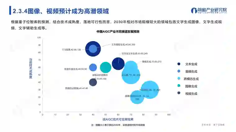 而结合技术成熟度、落地可行性而言,2023年相对市场规模较大的领域包括文字生成图像、文字生成视频、文字辅助生成等。