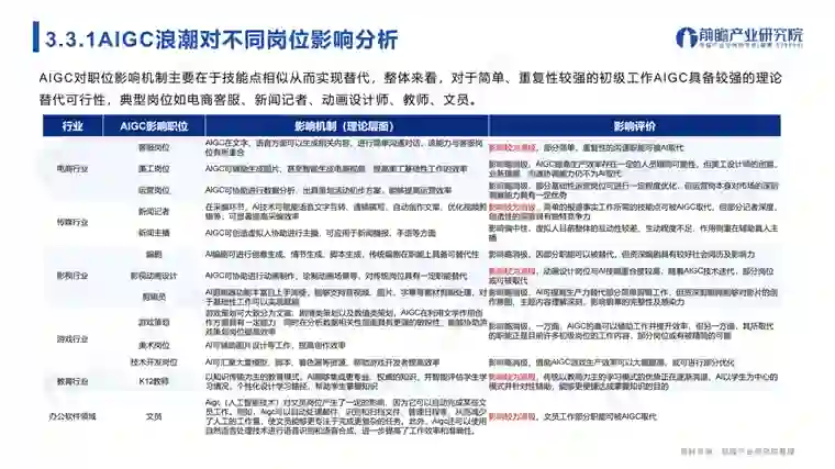 同样,AIGC也会对不同的岗位造成不同程度的冲击。AIGC对职位影响机制主要在于技能点相似从而实现替代。整体来看,对于简单、重复性较强的初级工作AIGC具备较强的理论替代可行性,典型岗位如电商客服、新闻记者、动画设计师、教师、文员。