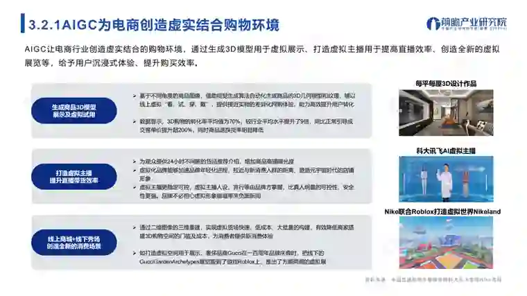 AIGC让电商行业创造虚实结合的购物环境,通过3D模型用于虚拟展示、打造虚拟主播用于提高直播效率、创造全新的虚拟展览等,给予用户沉浸式体验、提升购买效率。