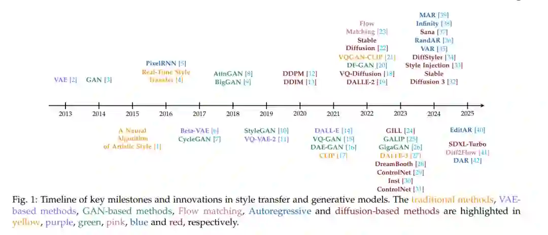 “我梦见自己的画作,然后我画出自己的梦。” ——文森特·梵高 风格迁移旨在学习一个映射函数 F : (Ic, Is) ↦ It, 其中输出图像 It 在保留内容图像 Ic 的结构语义的同时,匹配参考图像 Is 的风格统计特征。 自 Gatys 等人的开创性研究【1】以来,该领域已经从缓慢的优化方法发展到毫秒级的前馈生成器,近年来更是跃升至支持 4K 分辨率和细粒度语义控制的扩散模型与自回归(AR)生成管线。风格迁移技术广泛应用于肖像润饰、实时视频风格化以及游戏与电影中的三维资产生成。 过去十年的研究揭示了三次颠覆性飞跃: (i) 神经风格迁移展示了卷积网络中的 Gram 统计量能够编码可迁移的风格; (ii) 实时生成器与对抗训练带来了逼真的写实风格; (iii) 2022–2025 年的扩散与自回归系统在规模与可控性上实现了双重突破。 然而,核心挑战依然存在:如何在有限计算资源下,在感知保真度、生成速度与风格多样性之间取得平衡。
