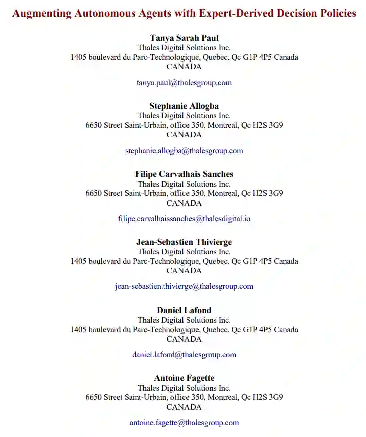 第一步是对四位专家进行访谈。我们采访了来自泰雷兹陆地和航空系统公司的三位航空航天和导航领域专家,以及泰雷兹加拿大防务与安全公司和加拿大皇家骑警反无人机专家。第四位专家是一名战斗机飞行员。这些专家帮助提供了对情景的反馈意见,并帮助验证了专家政策建模的输入。除专家反馈外,我们还借鉴了上述先前的研究成果,以确保概念验证研究基于现实的假设。
