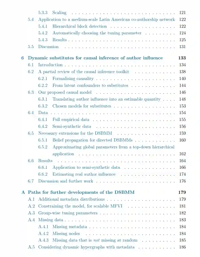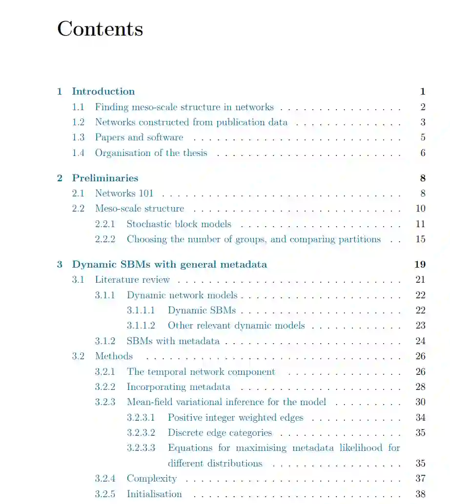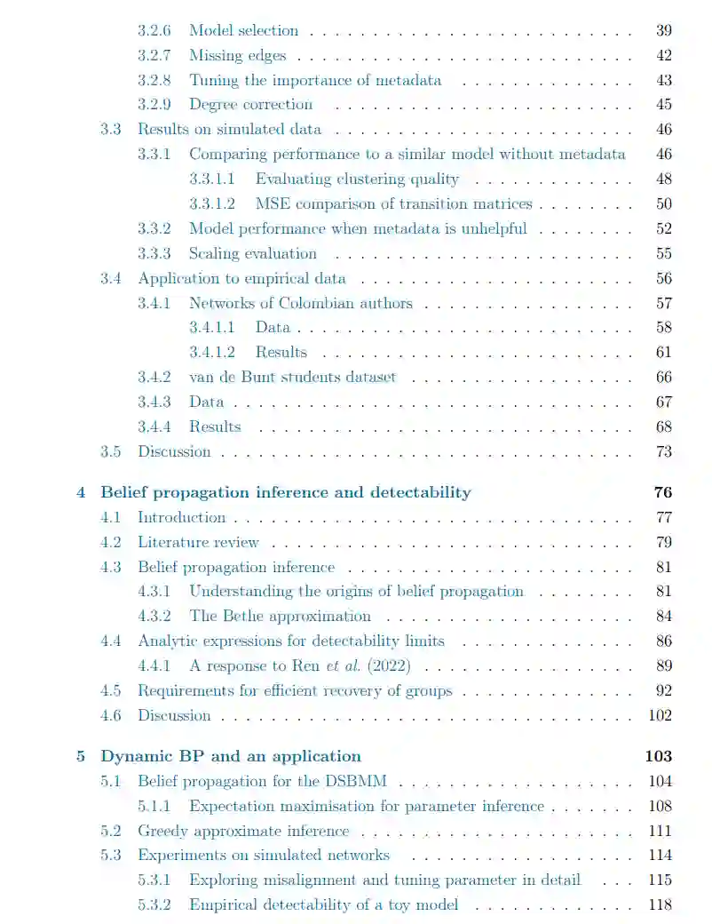 尽管这种元数据可能有潜在的用途,但直到最近才开始将网络和元数据共同建模的方法。在本论文中,我们提供了一类新的模型,旨在找到随时间变化的网络中的群组。我们描述了该类模型的不同版本,允许网络具有加权和有向性,并避免了将具有相似度数的节点放入同一组的潜在问题。 除了详细说明这些模型外,我们还推导了在存在元数据的情况下,有效检测群组的新要求,并解释了为什么一篇最近的论文声称在类似的静态模型中实现了相同的效果,但存在缺陷。我们利用的推理方法也具有高度可扩展性,我们通过提出一种“贪婪”方案和一种递归过程进一步加速了这个过程,有效地提供了网络群组的自顶向下层次结构。