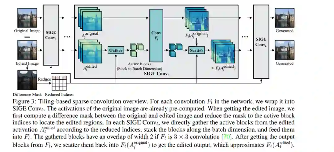 在图像编辑过程中,现有的深度生成模型倾向于从头重新合成整个输出,包括未编辑的区域。这将导致严重的计算浪费,特别是对于较小的编辑操作。在这项工作中,我们提出了空间稀疏推断(SSI),这是一种通用技术,可选择性地对编辑区域执行计算,并加速各种生成模型,包括条件GANs和扩散模型。我们的主要观察结果是,用户倾向于对输入图像进行渐进的更改。这促使我们缓存和重用原始图像的特征映射。给定一个编辑过的图像,我们对编辑过的区域稀疏地应用卷积滤波器,而对未编辑的区域重用缓存的特征。基于我们的算法,我们进一步提出了稀疏增量生成引擎(稀疏增量生成引擎,SIGE),将现有硬件上的计算减少转化为延迟减少。在1.2%的编辑区域中,我们的方法在保持视觉保真度的同时,减少了7.5× DDIM和18× GauGAN的计算。利用SIGE,我们将DDIM在RTX 3090和Apple M1 Pro CPU上的推理时间分别提高了3.0×和6.6×,将ggaan在RTX 3090和Apple M1 Pro CPU上的推理时间分别提高了4.2×和14×。