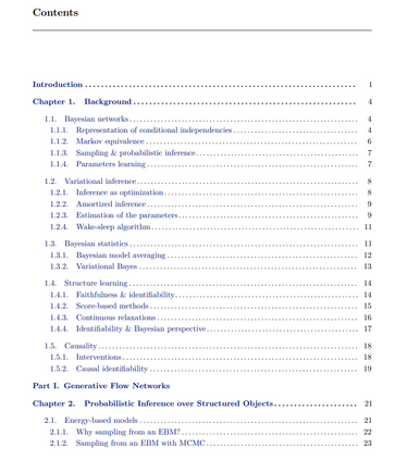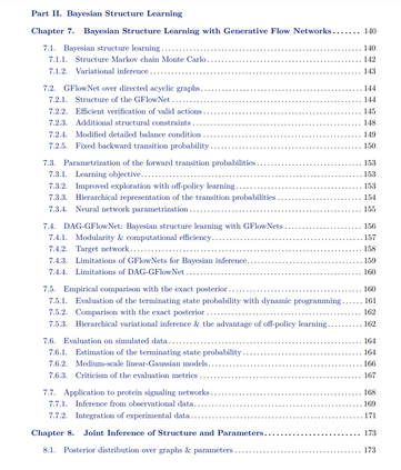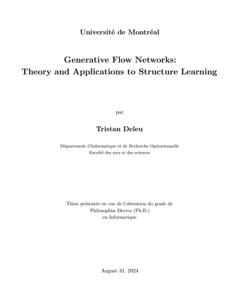 然而,正如贝叶斯推断中的许多问题一样,由于可能的结构数量庞大(这些结构通常表示为有向无环图,DAG),后验分布通常是不可解的。因此,需要进行近似。尽管过去十年中,生成建模领域取得了显著进展,尤其是由变分推断和深度学习强力结合推动的进展,但大多数这些模型都集中于连续空间,使得它们不适用于涉及离散对象(如有向图)的问题,因为这些对象存在高度复杂的无环性约束。 在本论文的第一部分,我们介绍了生成流网络(GFlowNet),一种专门为离散和组合对象(如图)上的分布而设计的新型概率模型。