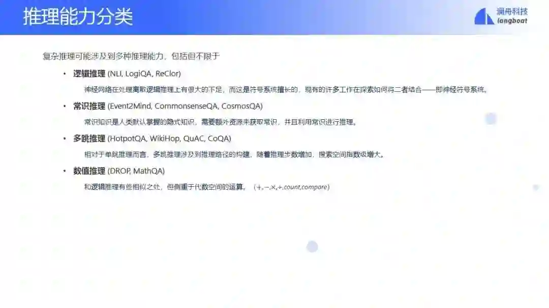 这个任务一般可以分为逻辑推理、常识推理、多跳推理和数值推理。比如说常识推理,需要我们在推理的时候掌握基本的常识。再比如多跳推理,比尔·盖茨的太太的公司,比尔盖茨的太太算一跳推理,太太的公司就是两跳推理。还有数值推理,基于数字运算,比如火车时速100公里,那经过100米长,要开几分钟等等。