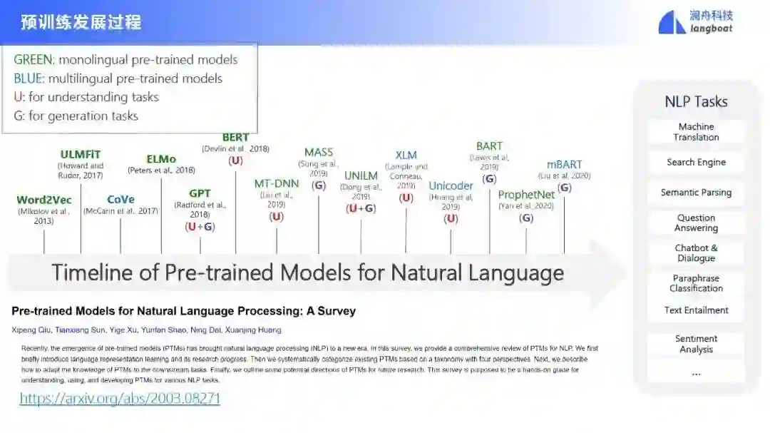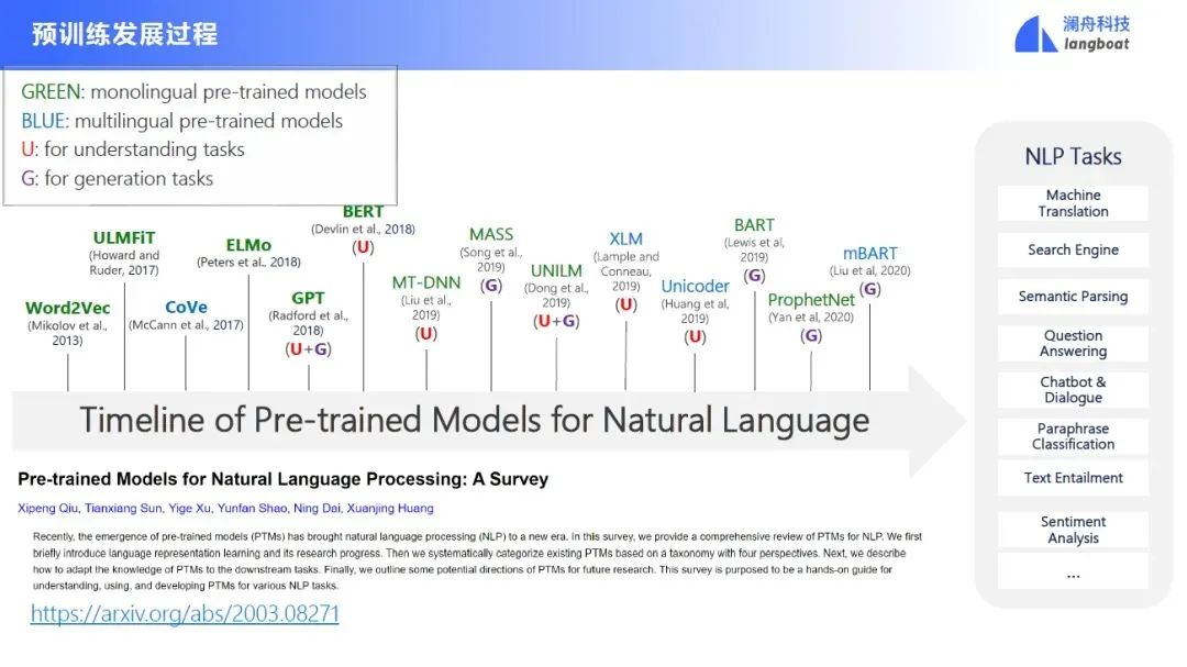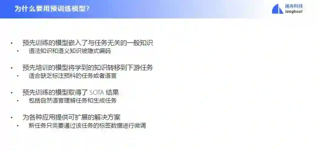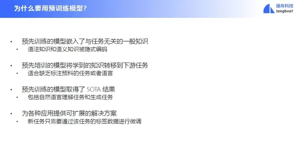 为什么要用预训练模型呢?第一个是因为预先训练的模型嵌入了与任务无关的一般知识,所有语法知识和语义知识都被隐式编码了;第二个是我们可以将预训练模型学到的知识迁移到下游任务,面对一些缺少数据的任务和语言,预训练模型也能管用;第三是预先训练的模型在自然语言理解和生成任务上取得了 SOTA 结果;最后是因为预训练模型可以为各种应用提供可扩展的解决方案。