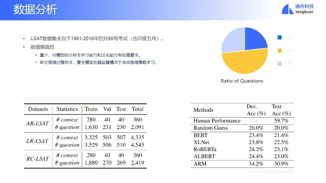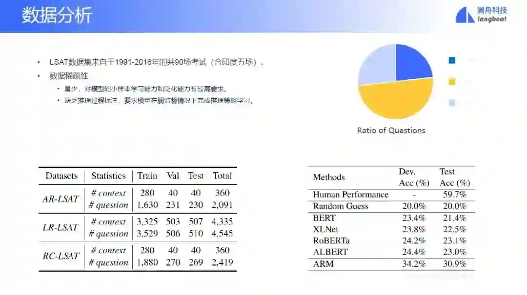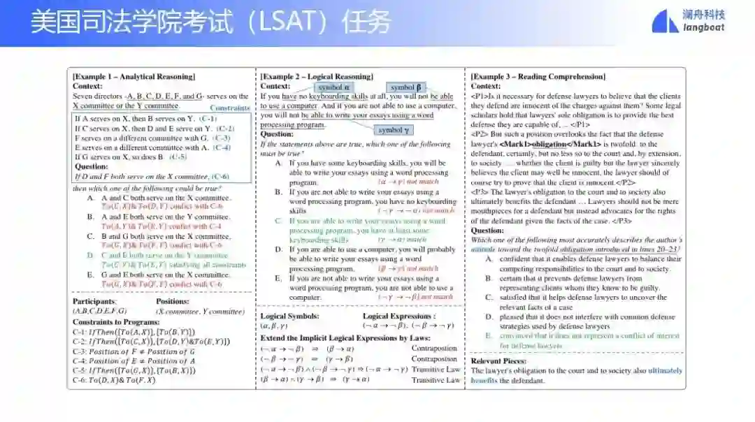 这里介绍一个任务,美国司法学院考试(LSAT)。这个考试有三大类型问题,第一大类型问题叫逻辑推理,第二大类叫分析推理,第三大类叫阅读理解。美国大概有300所司法学校或者学院,我们使用模型参加这个考试,大概是能进Top104。