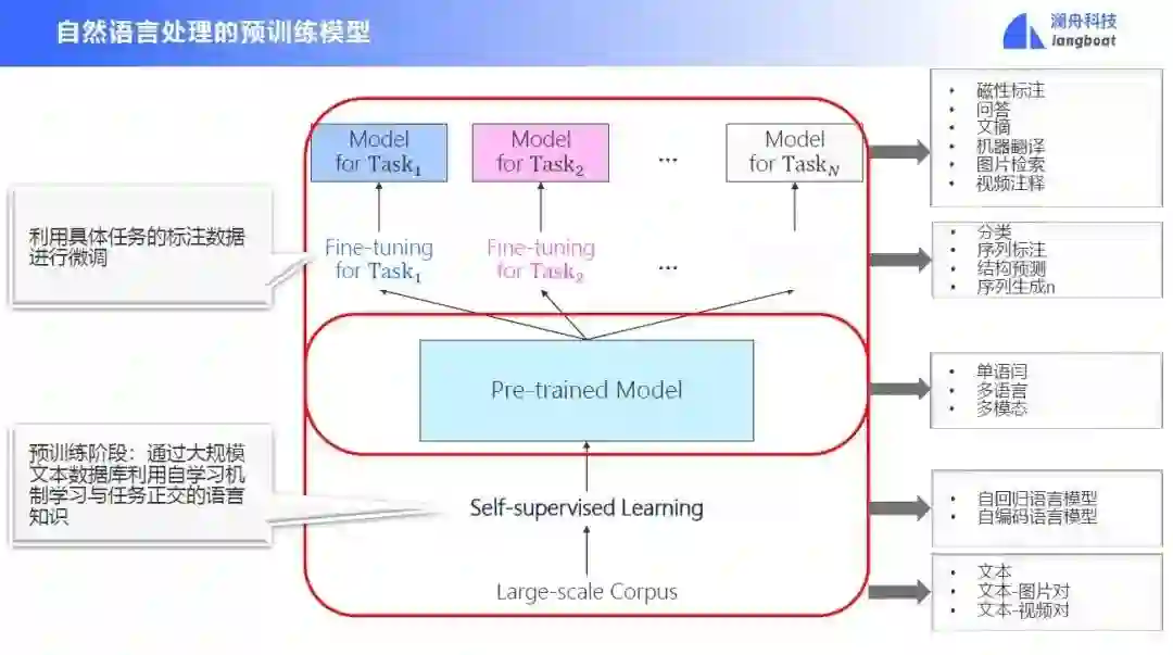 将神经网络原理和一些神经网络架构结合,我们可以进行大数据的预训练。预训练需要大规模的语料库,让模型在其基础上进行自监督学习,学习每个词的语义向量表示。得到预训练模型后,我们可以结合具体的下游任务对模型进行一些微调,使其适配下游任务的要求。用这一套技术,几乎可以解决所有语言、所有场景下的所有任务。