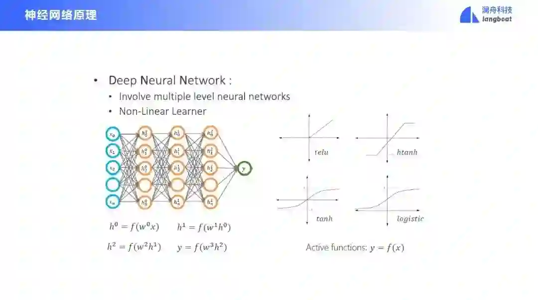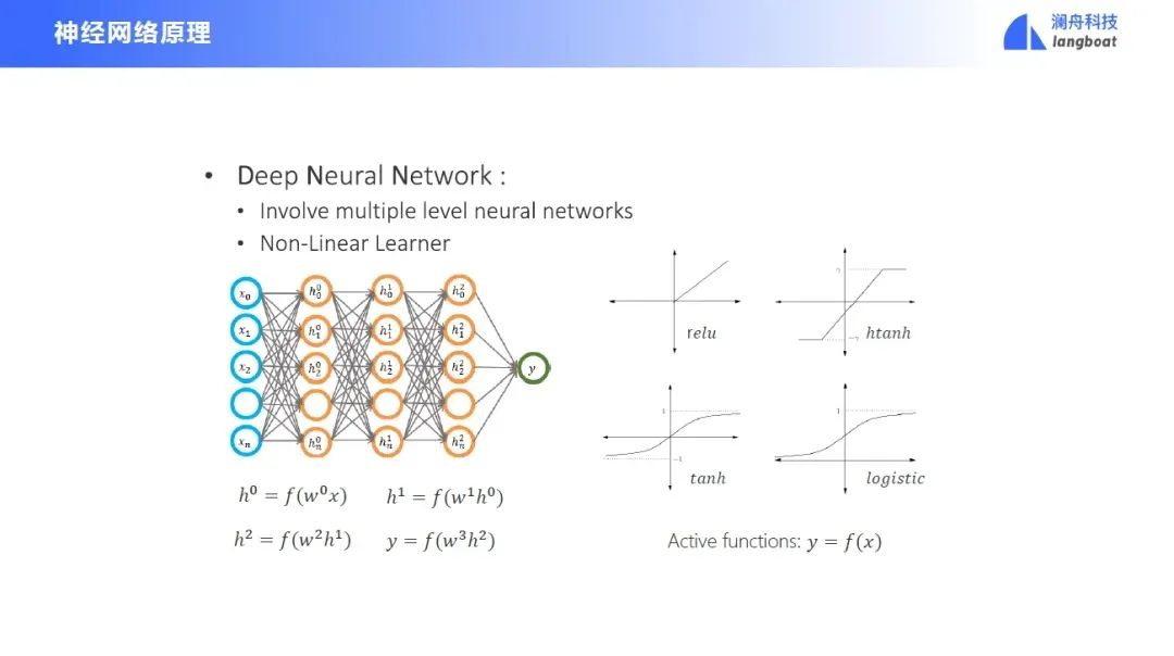 下面我们快速回顾一下神经网络原理。神经网络有一个输入层、一个输出层,中间还有一些隐层。每个隐层结合了前面的所有的输入信号,并进行加权,输入激活函数中得到一个结果,再输入下一层。最后走到输出层后,会得到一个预测结果,与正确结果进行比对,得到损失函数。然后将损失的梯度回传到整个神经网络,进行参数的更新。
