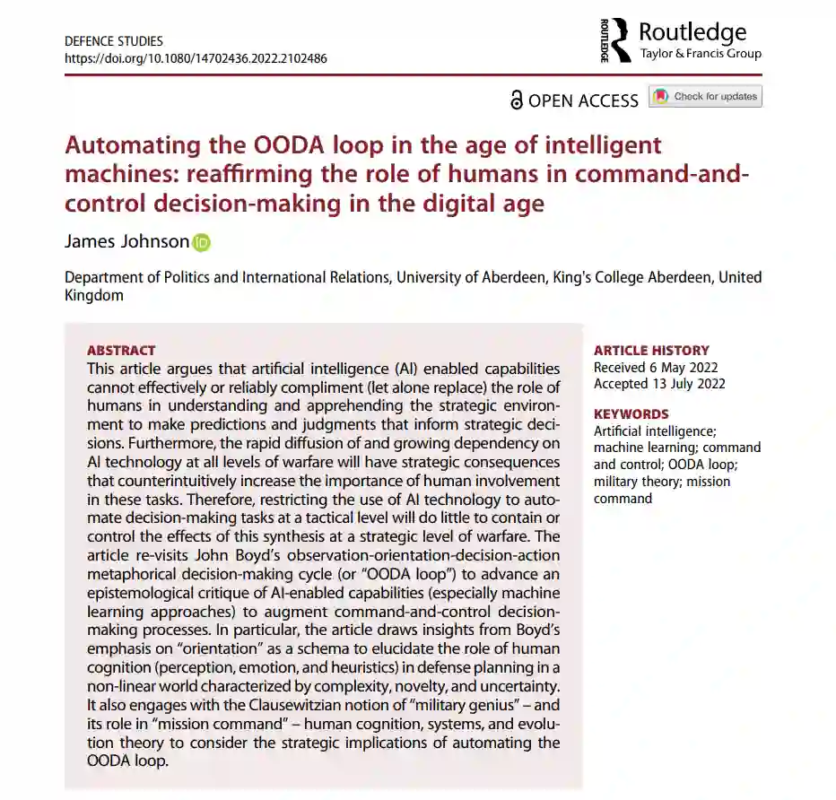文章重新审视了约翰-博伊德的观察-定位-决策-行动的隐喻决策循环(或 "OODA循环"),以推进对使用人工智能-ML能力来增强指挥和控制决策过程的客观认识论批评(Boulanin 2020)。为此,文章从博伊德强调的 "方向"(或 "大O")中得到启示,阐明了人类认知(感知、情感和启发式方法)在国防规划中的作用,以及在一个以复杂性、新颖性和不确定性为特征的非线性世界中理解更广泛战略环境的重要性。它还涉及克劳塞维茨的 "军事天才 "概念(特别是其在 "任务指挥 "中的作用),(Howard和Paret;Grauer 2016;Beyerchen 1992-1993;Biddle 2004;King 2019),人类认知(Kahneman;Ariely,Kahneman et al. 1982;Baron 2008;Robert 2006),以及系统和进化理论(Jantsch 1980;Prigogine and Stengers 1984;Perrow 1999;Jervis 1997;Thomas 1999),来考虑OODA循环自动化的战略意义。这篇文章与最近越来越多的文献相呼应,这些文献考虑了在军事决策结构和过程中采用人工智能技术--以及自主武器、大数据、网络空间和其他与 "第四次工业革命"(Barno和Bensahel)相关的新兴技术的战略影响(Raska 2021;Talmadge 2019;Goldfarb and Lindsay 2022)。
