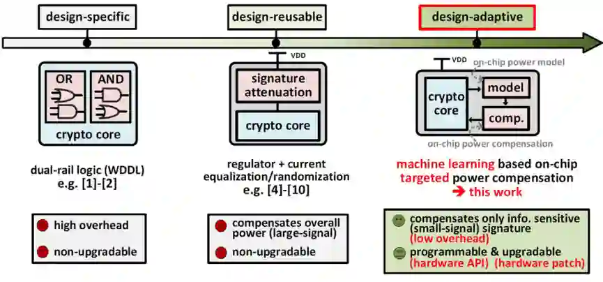 本研究提出了一种新型的设计自适应(design-adaptive)反制方法,使用机器学习技术提取加密芯片工作时的敏感信息功率特征,并针对它进行自适应功率补偿,并具备固件升级能力。该技术可在多标准加密芯片里实现跨加密算法复用,并且仅对敏感信息进行功率补偿从而极大地降低功耗开销。轻量级机器学习功率补偿技术能够支持在整个设备的生命周期内进行固件更新以应对新型旁路攻击方式。 图2展示了该机器学习功率补偿技术的系统架构。其中,特征提取电路对加密算法处理器的敏感信号(即与密钥相关)相关的累积能量进行建模并提取相关特征。功率预测电路通过机器学习算法计算所需补偿的能量,并通过一个数字化的电容型功率补偿电路实现敏感信息能量补偿。该技术直接补偿真正与密钥相关的小信号的能量贡献,从而避免现有技术中对整个加密核心功率进行不加选择的高功率补偿或屏蔽。