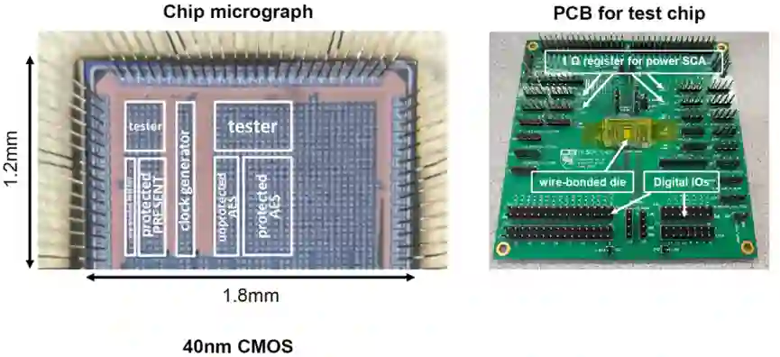该方案使用40nm CMOS工艺进行了流片验证(图3),测试了两种不同的加密算法(AES-128和PRESENT-80)对抗旁路攻击的效果,展示了对于不同加密方案的适应性,并引入新型旁路攻击手段对PRESENT-80加密方案进行攻击,演示了通过固件更新来应对新的旁路漏洞的硬件修补功能。测试结果显示,该方案比已有的最好相关工作的效果提升3倍以上,并且只占用了8.6%的功耗开销,比最近具有最高 MTD 的工作低 5.8倍。这得益于机器学习功率预测电路能够针对性地补偿敏感信息的小信号功率,而不是无差别地掩盖系统整体的大信号功率起伏。