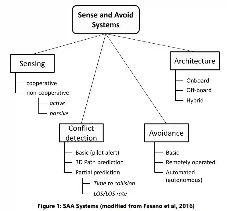 在探测和规避方法方面,我们按照 SAA 流程进行了全面研究,从探测冲突、危险或潜在威胁,到跟踪目标(物体)的运动;评估风险和可信度;根据评估参数确定冲突的优先级;然后宣布或确认冲突以及冲突的程度;确定正确的冲突解决方法;随后下达命令并最终执行。为了支持这一过程,我们审查了各种 SAA 算法,包括探测算法、跟踪算法和规避策略。我们认为,(4)基于学习的智能算法需要列入未来 SAA 的要求中,因为它们具有支持任务的自适应能力。