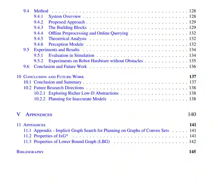 对于动态复杂的机器人任务,运动规划需要在速度、加速度、力/扭矩和运动学等约束条件内进行明确推理,例如避免障碍物。为了满足这些约束,规划算法必须同时进行高层次的离散决策和低层次的连续决策。例如,推动重物涉及对接触位置的离散决策和对细微交互的连续决策。现有的方法要么在通过采样构建的图上搜索,要么系统地对规划空间进行离散化,或优化受微分约束的参数化轨迹。然而,这些方法面临组合复杂性或在长时间范围内缺乏收敛的问题。我们假设这些高层次的离散决策通常位于完整规划空间的低维子空间中。因此,本论文主张,通过在该低维离散空间中交错搜索与在完整规划空间中的选择性推理,我们可以高效地发现全局、长时间范围内、动态丰富的任务能力。