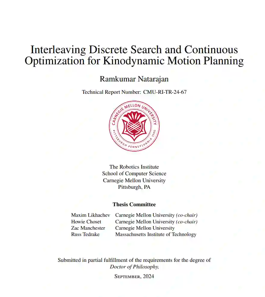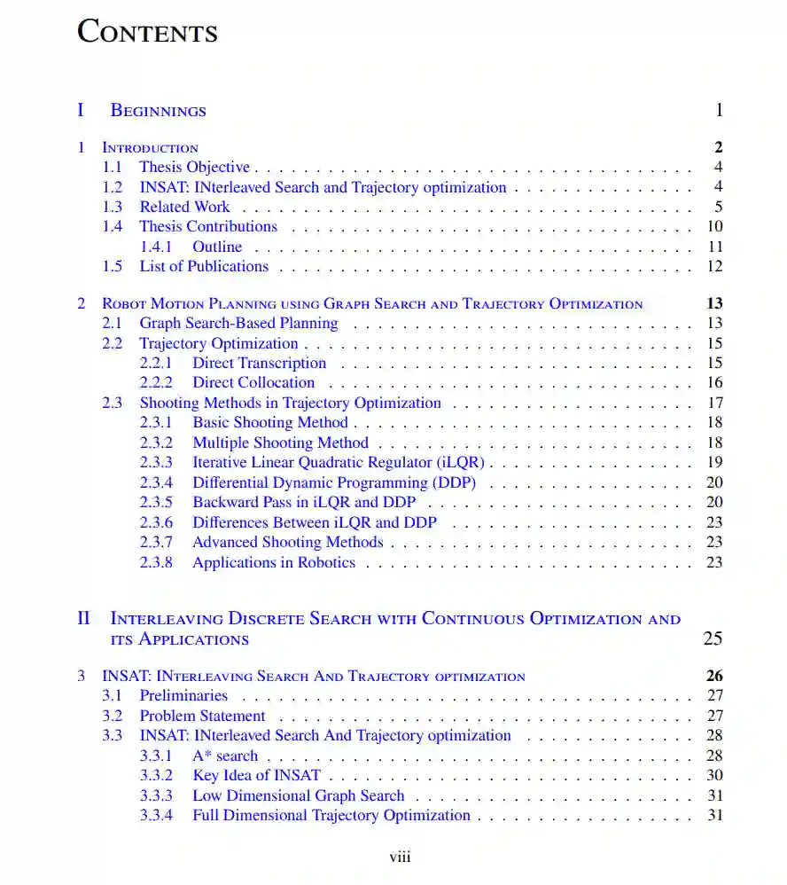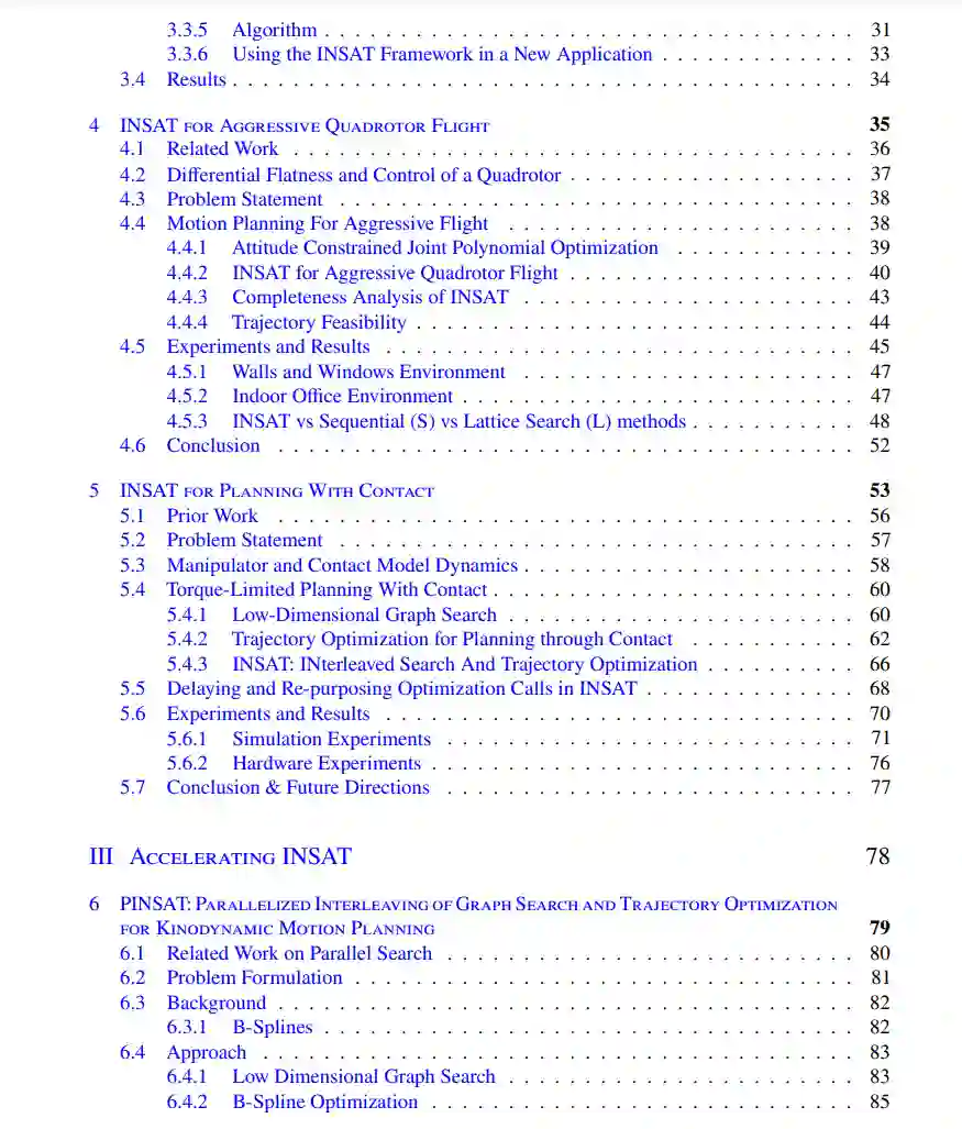 本论文的目标是实现复杂动态系统长时间范围计划的自动发现。为此,我们提出了交错搜索与轨迹优化算法(INSAT)。INSAT结合了基于图的规划算法在非凸状态空间中寻找路径的优势和轨迹优化在高维空间中寻找动态可行轨迹的优势。我们在两个具有挑战性的领域展示了INSAT的有效性:1)在大环境中的激进四旋翼飞行(模拟)和2)在狭小空间中对重物的接触丰富操控。我们还表明,通过交错图搜索和轨迹优化,INSAT能够解决简单初始化的轨迹优化或独立图搜索无法解决的规划问题。