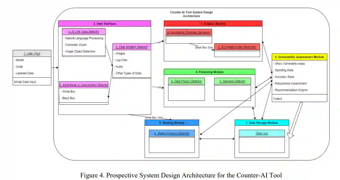 这项工作包括在征求研究、设计和开发用于人工智能(AI)系统对抗性测试和评估的反人工智能工具的初步建议和结论。该报告包括对相关人工智能概念的文献回顾和对抗性人工智能领域的广泛研究。一项密集的利益相关者分析,包括从20多个政府和非政府组织中征集需求,协助确定哪些功能需求应包括在反人工智能工具的系统设计中。随后的系统架构图接受用户输入,测试各种类型的对抗性人工智能攻击,并输出人工智能模型的脆弱性。在这个工具投入使用之前,伙伴组织将进行迭代实验,这是开发和部署这个反人工智能工具的下一个步骤。