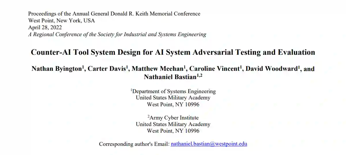然而,随着人工智能系统实施和采用的增加,对手已经威胁要攻击和操纵这些系统;目前,没有现成的工具来帮助对人工智能系统进行对抗性测试和评估(T&E),以便在其投入使用之前评估漏洞和失败模型。在任务使用情况下,美国防部不应该在没有事先评估安全或反人工智能措施的有效性的情况下部署这些人工智能系统。设计和建立有弹性的人工智能系统对人工智能防御至关重要,因为这些系统更容易解释,更值得信赖,并能确保其免受各种已确定的对抗性攻击方法的影响。