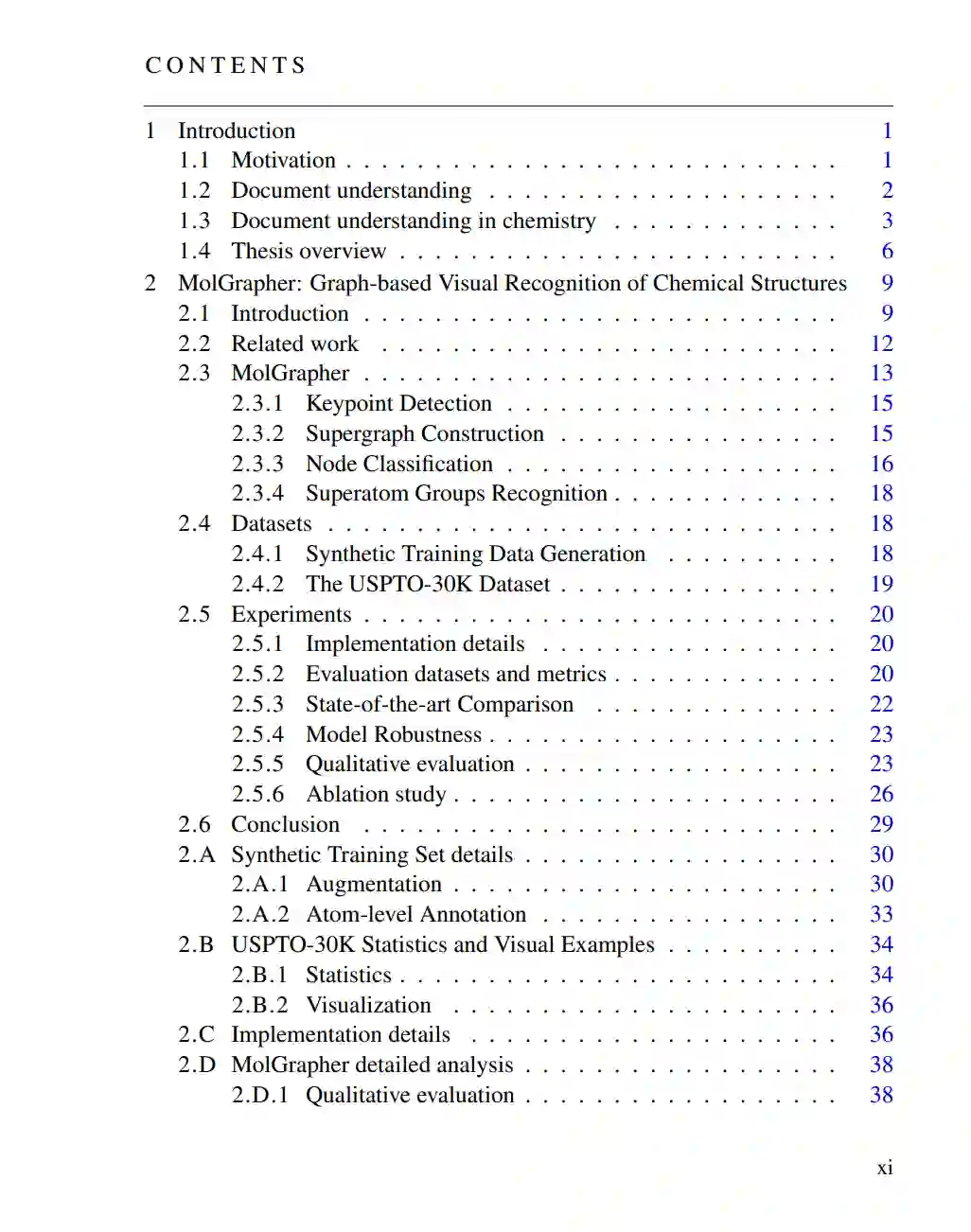 科学知识的构建、阐释与验证,主要依赖于科研论文与专利文献。然而,这类文档往往采用非标准格式、版面布局多样且内容多模态,给自动化分析带来了障碍。这些挑战削弱了信息检索系统的效能,并限制了在大规模文档集上训练机器学习模型的能力。现有自然语言处理技术通常将文档视为纯文本,忽视了视觉信息的关键作用。尤其在化学领域,化学结构图与马库什(Markush)结构等视觉要素对理解文档内容至关重要。 为弥补这一缺口,本论文提出了新的机器学习方法,用于从文档中抽取化学结构与马库什结构。此外,论文构建了一个从专利文献中抽取的化学结构大型数据库。该数据库支持对专利文献的深入分析,并可用于面向特定任务的机器学习模型训练。 论文第一部分介绍 MolGrapher,这是一种将化学结构图像转换为分子图(molecular graph)的模型。MolGrapher 对输入图像进行三阶段处理:首先使用卷积神经网络检测分子中原子的位置;随后构建由候选原子与化学键组成的超图(supergraph);最后结合卷积神经网络与图神经网络对该超图的节点进行分类。该架构在训练效率、对低分辨率图像的稳健性以及对大型复杂分子图像的处理能力方面表现出色。 论文第二部分在 MolGrapher 的基础上,提出了一个完整的文档化学结构抽取流程,集成了页面分割、图像分类与基于 MolGrapher 的分子图识别。该工作流程应用于大规模专利文献集,构建了 PatCID 数据库:该库包含来自一百多万份文档的 8,000 万余条化学结构。PatCID 既可用于定位提及特定分子的文档,也可作为下游机器学习任务的高质量训练数据来源。实验表明,与现有自动生成的数据库相比,PatCID 在质量与覆盖面方面均更优;同时,PatCID 也是对人工构建数据库的有力补充。 论文最后一部分探讨马库什结构的识别问题。马库什结构是一种用于在文档中定义相关分子家族的表征方式,该任务具有挑战性,要求对视觉图示与文本成分进行联合解析。为此,论文提出 MarkushGrapher,该模型结合了视觉-文本-版式(Vision-Text-Layout)编码器与光学化学结构识别(Optical Chemical Structure Recognition, OCSR)编码器。MarkushGrapher 将马库什结构转化为由图与表组成的结构化表示:图对应结构的视觉部分,表对应其文本定义。实验结果显示,MarkushGrapher 在多种评测设定下显著优于化学专用模型与通用视觉-语言模型。