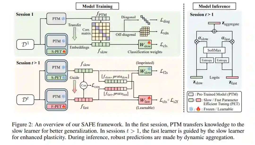 为了解决上述问题,我们提出了一个慢速与快速参数高效调优(SAFE)框架。具体来说,为了继承基础模型中的通用知识,我们通过衡量预训练模型与应用PET后的模型之间的相关性,加入了一个迁移损失函数。在第一阶段进行校准后,慢速高效调优的参数能够捕捉到更多的信息特征,从而提高对后续类别的泛化能力。此外,为了进一步融入新概念,我们在稳定性和适应性之间找到了平衡,通过固定慢速高效调优参数并持续更新快速参数来实现这一目标。具体而言,我们提出了一种跨分类损失与特征对齐方法,用以规避灾难性遗忘。在推理阶段,我们引入了一种基于熵的聚合策略,动态地利用慢速和快速学习者之间的互补性。 在七个基准数据集上的广泛实验验证了我们方法的有效性,显著超越了当前的最新技术。代码将在 https://github.com/MIFA-Lab/SAFE 上发布。