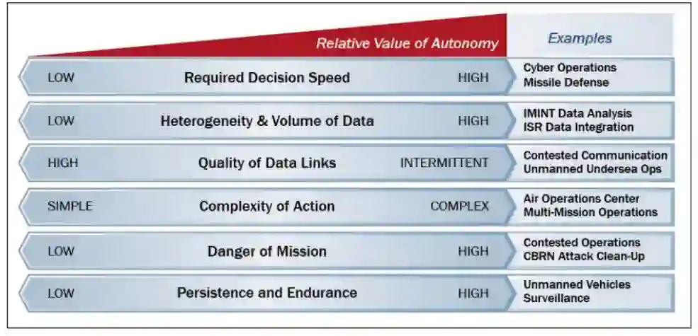 SAC的自主性是一个复杂的问题,由(至少)三个变量驱动:1)人类操作员和机器之间的指挥和控制关系的特点和质量;2)完全或部分委托给SAC的决策类型;以及3)SAC的复杂性、成熟度和可靠性。因此,自主权最好被理解为一个包含所有这些因素的总括性术语。