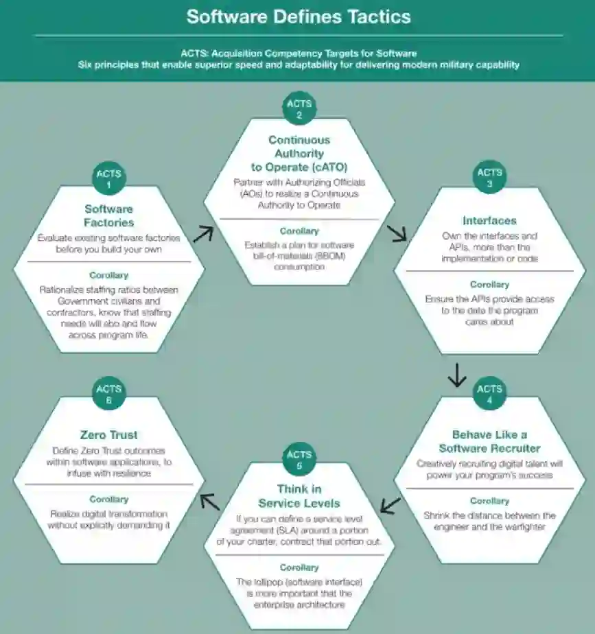 软件交付是指在正确的时间将正确的部分送到正确的地方。为软件明确这些采购能力目标是帮助采购界更有效地驾驭软件世界的又一步骤。必须认识到并探索形式多样性的价值--软件的异质性,以及一刀切的方法与作战人员必须在软件定义的世界中作战的事实是不一致的。国防部的行动必须认识到,软件,而不是传统的作战平台,控制着现代杀伤链和军事困境的速度和效率。最后,国防部需要正式承认软件、数据和人工智能/机器学习的数字三元组是平等的同行。这样做将有助于国防部在一个由软件定义战术的时代找到自己的立足点。