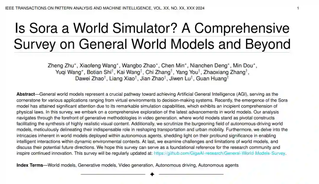 通用世界模型代表了实现通用人工智能(AGI)的关键途径,是从虚拟环境到决策系统等各类应用的基石。近期,Sora模型的出现因其卓越的模拟能力而备受关注,展现出对物理定律的初步理解。在这篇综述中,我们将全面探索世界模型的最新进展。我们的分析涵盖了视频生成领域的前沿生成方法,在该领域,世界模型作为核心结构,促进了高度逼真的视觉内容合成。此外,我们深入研究了自动驾驶世界模型这一新兴领域,详细描述了其在重塑交通和城市移动性方面不可或缺的作用。进一步地,我们剖析了部署于自主智能体中的世界模型的复杂性,阐明了它们在实现动态环境中智能交互方面的重要意义。最后,我们探讨了世界模型的挑战和局限性,并展望了其潜在的未来方向。我们希望这篇综述能够为研究社区提供一个基础性参考,并激发持续的创新。这篇综述将定期更新,网址为:https://github.com/GigaAI-research/General-World-Models-Survey。