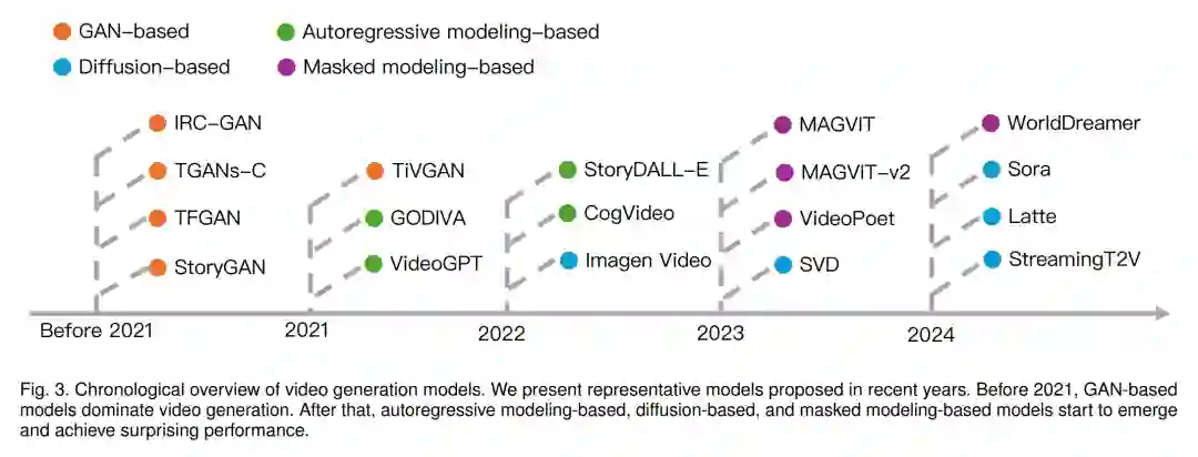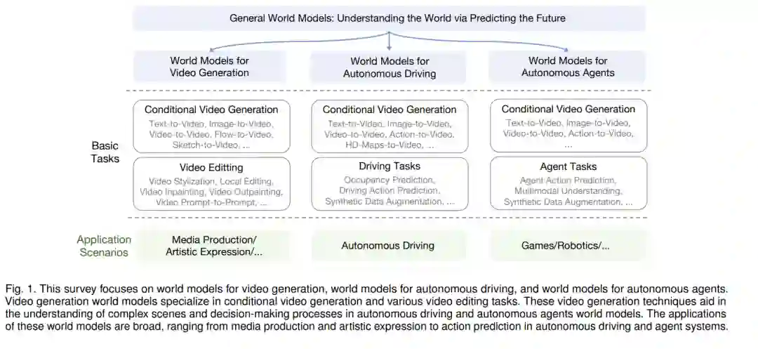 在追求通用人工智能(AGI)的过程中,开发通用世界模型是一条基本途径。通用世界模型旨在通过生成过程来理解世界。值得注意的是,Sora模型的引入[21]引起了广泛关注,其卓越的模拟能力不仅展示了对物理定律的初步理解,还突显了世界模型领域的可喜进展。站在人工智能驱动创新的前沿,有必要深入研究世界模型领域,揭示其复杂性,评估其当前发展阶段,并思考其未来可能的发展轨迹。 世界模型通过预测未来来加深对世界的理解。这种预测能力在视频生成、自动驾驶和自主智能体的发展中具有巨大潜力,代表了世界模型的三个主流发展方向。如图1所示,视频生成世界模型涵盖了视频的生成和编辑,以理解和模拟世界,为媒体制作和艺术表达带来了价值。借助视频生成技术,自动驾驶世界模型可以创建驾驶场景,从驾驶视频中学习驾驶要素和策略。这一知识有助于直接生成驾驶动作或训练驾驶策略网络,从而推动端到端自动驾驶。类似地,智能体世界模型利用视频生成技术在动态环境中建立智能交互。与驾驶模型不同,它们构建的策略网络适用于各种虚拟(例如游戏或模拟环境中的程序)或物理(例如机器人)情境。 在全面世界建模的基础上,视频生成方法通过视觉合成揭示物理定律。最初,生成模型主要集中在图像生成[10]、[33]、[46]、[66]、[155]、[168]、[173]、[177]、[236]和编辑[95]、[129]、[154]、[245]上,为合成动态视觉序列的更复杂进展奠定了基础。随着时间的推移,生成模型[17]、[18]、[52]、[63]、[68]、[84]、[111]、[229]、[243]不仅能够捕捉图像的静态特征,还能将一系列帧无缝串联起来。这些模型已经发展出了一定的物理和运动理解能力,代表了早期和有限形式的通用世界模型[62]。值得注意的是,Sora模型[21]处于这一演化的前沿。通过利用生成技术的力量,Sora展示了生成精细视觉叙事的深刻能力,并遵循物理世界的基本原则。生成模型和世界建模之间的关系是共生的,相互启发和丰富。生成模型可以在受控环境中构建大量数据,从而减轻对现实世界数据采集的广泛需求,尤其有利于训练实际应用中必需的人工智能系统。此外,生成模型的有效性关键取决于世界模型所提供的理解深度。正是世界模型对潜在环境动态的全面理解,赋予了生成模型在严格物理约束下产生质量更高的视觉信号的能力,从而增强了它们在各个领域的真实性和实用性。