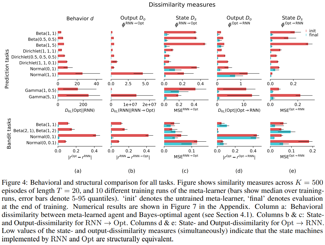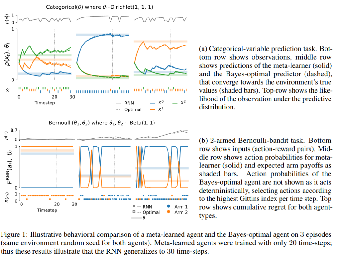 元学习代理的行为类似贝叶斯最优agent(第4.1节)。也就是说,元学习agent做出的预测和行动实际上与贝叶斯最优agent无法区分。