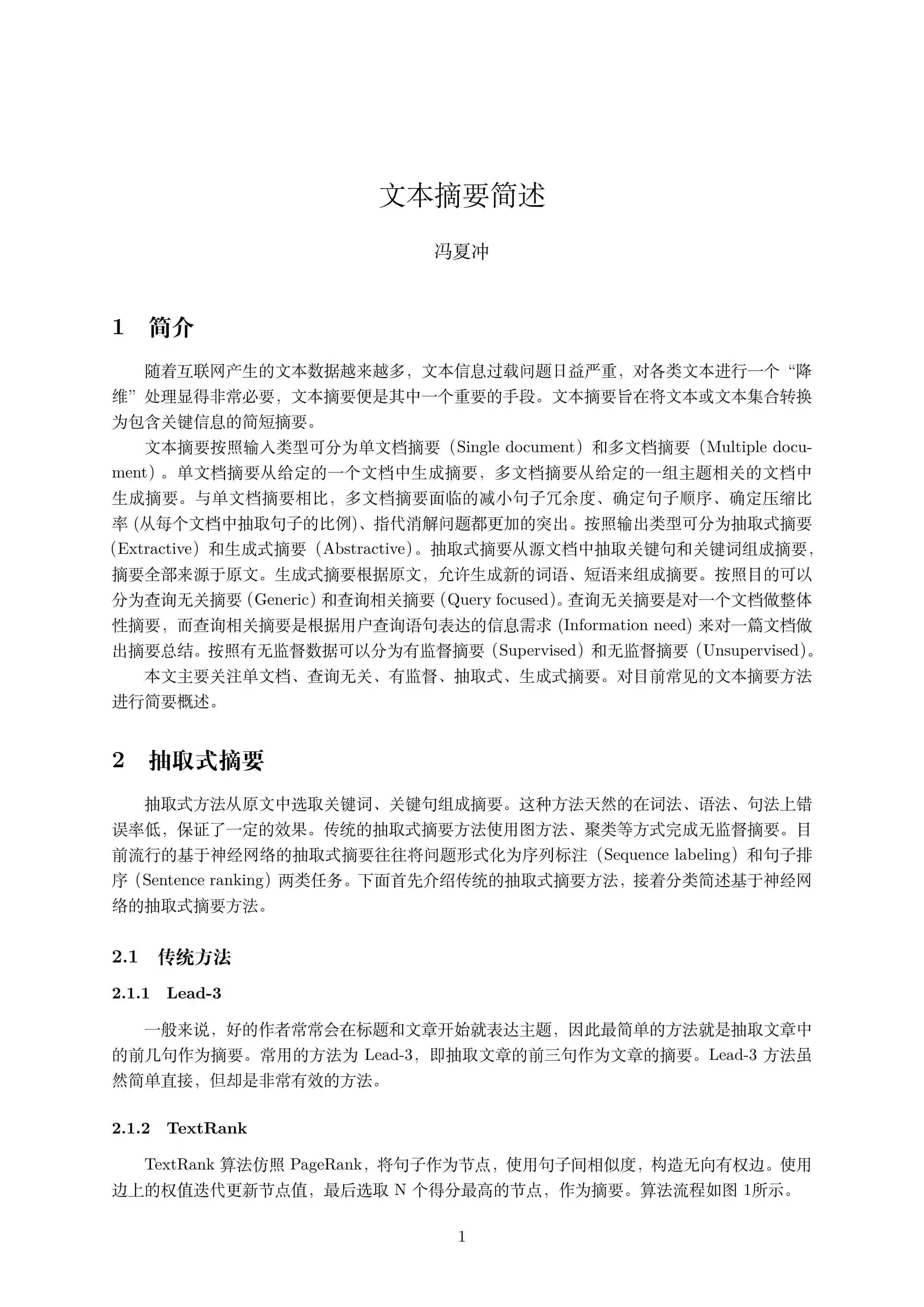 随着互联网产生的文本数据越来越多,文本信息过载问题日益严重,对各类文本进行一个“降 维”处理显得非常必要,文本摘要便是其中一个重要的手段。文本摘要旨在将文本或文本集合转换 为包含关键信息的简短摘要。 文本摘要按照输入类型可分为单文档摘要(Single document)和多文档摘要(Multiple document)。单文档摘要从给定的一个文档中生成摘要,多文档摘要从给定的一组主题相关的文档中 生成摘要。与单文档摘要相比,多文档摘要面临的减小句子冗余度、确定句子顺序、确定压缩比 率 (从每个文档中抽取句子的比例)、指代消解问题都更加的突出。按照输出类型可分为抽取式摘要 (Extractive)和生成式摘要(Abstractive)。抽取式摘要从源文档中抽取关键句和关键词组成摘要, 摘要全部来源于原文。生成式摘要根据原文,允许生成新的词语、短语来组成摘要。按照目的可以 分为查询无关摘要(Generic)和查询相关摘要(Queryfocused)。查询无关摘要是对一个文档做整体 性摘要,而查询相关摘要是根据用户查询语句表达的信息需求 (Information need) 来对一篇文档做 出摘要总结。按照有无监督数据可以分为有监督摘要(Supervised)和无监督摘要(Unsupervised)。 本文主要关注单文档、查询无关、有监督、抽取式、生成式摘要。对目前常见的文本摘要方法 进行简要概述。