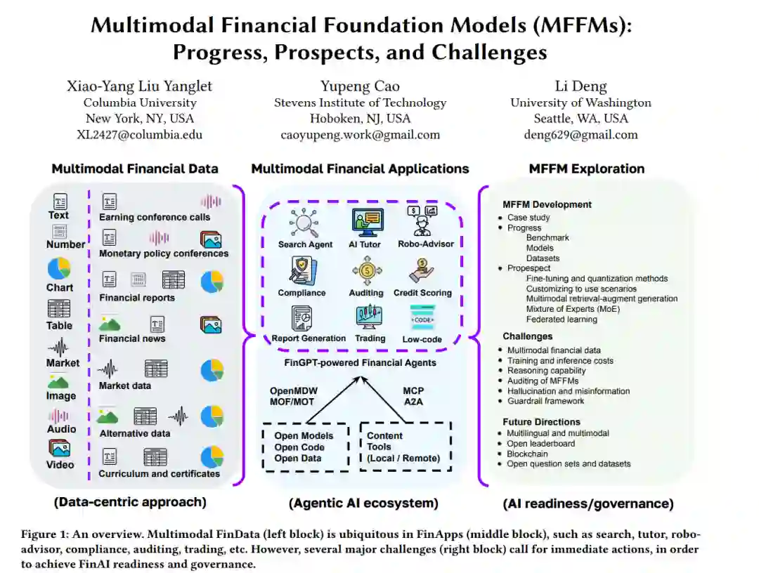 公众无法负担与亿万富翁沃伦·巴菲特共进私人午餐的费用。那么,如何以大约100美元的成本雇佣巴菲特作为我的随叫随到的财务顾问呢?在做出5000万美元的投资决定之前,如何以5000美元的费用与全球十大投资者举行一场精英头脑风暴会议呢?……不久后,当杨力(Yanglet)通过投资赚取了他的第一个100万美元时,他将会记得那晚李登博士帮助他修改多模态金融基础模型(MFFMs)研讨会的提案。 大语言模型(LLMs)已展示出在理解和生成类人文本方面的卓越能力。金融大语言模型(FinLLMs),如开源的FinGPT[26, 31, 49, 65, 67]和专有的BloombergGPT[60],在金融服务的某些领域表现出了巨大的潜力[16, 17]。不同于这种早期的以语言为中心的方法,多模态金融基础模型(MFFMs)能够处理交织的多模态金融数据,包括基础数据、市场数据、数据分析、宏观经济数据以及替代数据(如自然语言、音频、图像和视频)。多模态金融数据具有独特的特性,例如动态性、结构化与非结构化形式的并存,并且以不同的格式存在(如图表、图形、Web API、Excel电子表格、SEC文件、XBRL文件[13]和SQL数据[69])。 在实现MFFMs广泛应用的过程中,仍然面临诸多挑战,包括与可重复性、透明度、隐私和伦理相关的日益关注。首先,许多现有的LLMs作为“黑箱”运行,导致理解其操作并确保公平性成为挑战。另两个主要挑战是“模型自相残杀”(model cannibalism)和“开放清洗”(openwashing)。许多模型在训练和发布时缺乏透明度,例如Claude 3.5 Sonnet。许多所谓的“新颖”模型可能会利用现有LLMs(如GPT-4o)的标签并进行监督学习,这被称为“模型自相残杀”。因此,MFFMs在决策过程中是模糊不清的。它们带来了多种挑战,如缺乏关于训练数据的透明度、解决模型固有偏差的不足、安全性和防御问题(如后门攻击)。 近年来,出现了许多“开放清洗”行为,即将LLM的权重营销为“开放的”,但实际上受限于许可,而更理想的做法是采用OSI批准的许可(例如Apache 2.0许可证和MIT许可证)。哥伦比亚大学、牛津大学和Linux基金会的一个研究联盟提出了模型开放框架(Model Openness Framework)[57],该框架根据16个组成部分对模型进行排名,分类模型的开放性。该框架为研究人员和模型生产者提供了促进透明度和可重复性的指导。符合该框架的MFFMs将促进可重复性,并促进金融行业的广泛应用,例如开放FinLLMs[63]。对于金融机构,它为新模型在没有限制的情况下成为商业适用模型提供了明确的指导。 在本论文中,我们描述了MFFMs的进展、前景和挑战,并将在2024年与ACM国际金融人工智能会议(ICAIF)联合举办的MFFM研讨会上进行展示。本文还重点介绍了哥伦比亚大学SecureFinAI实验室对金融智能体(FinAgents)正在进行的研究。我们首先列出金融领域中的多模态金融数据和以数据为中心的方法(见图1左侧)。然后,我们描述了多模态金融应用(见图1中间部分)。我们设想,AI智能体是构建多个金融应用的有前景的解决方案。使用模型开放框架、许可(例如OpenMDW3)和智能体协议(例如模型上下文协议、Agent2Agent协议)可以构建金融智能体AI生态系统。然而,图1右侧列出了几个重大挑战,这些挑战需要立即解决,以实现金融AI的准备就绪。相关挑战包括专有数据的约束、训练和推理成本、监管复杂性、推理能力以及需要强有力的基准和防护框架来应对虚假信息和数据偏见。 我们相信,MFFMs将促进有前景的金融任务和数据分析,简化金融服务的运营。 相关工作: