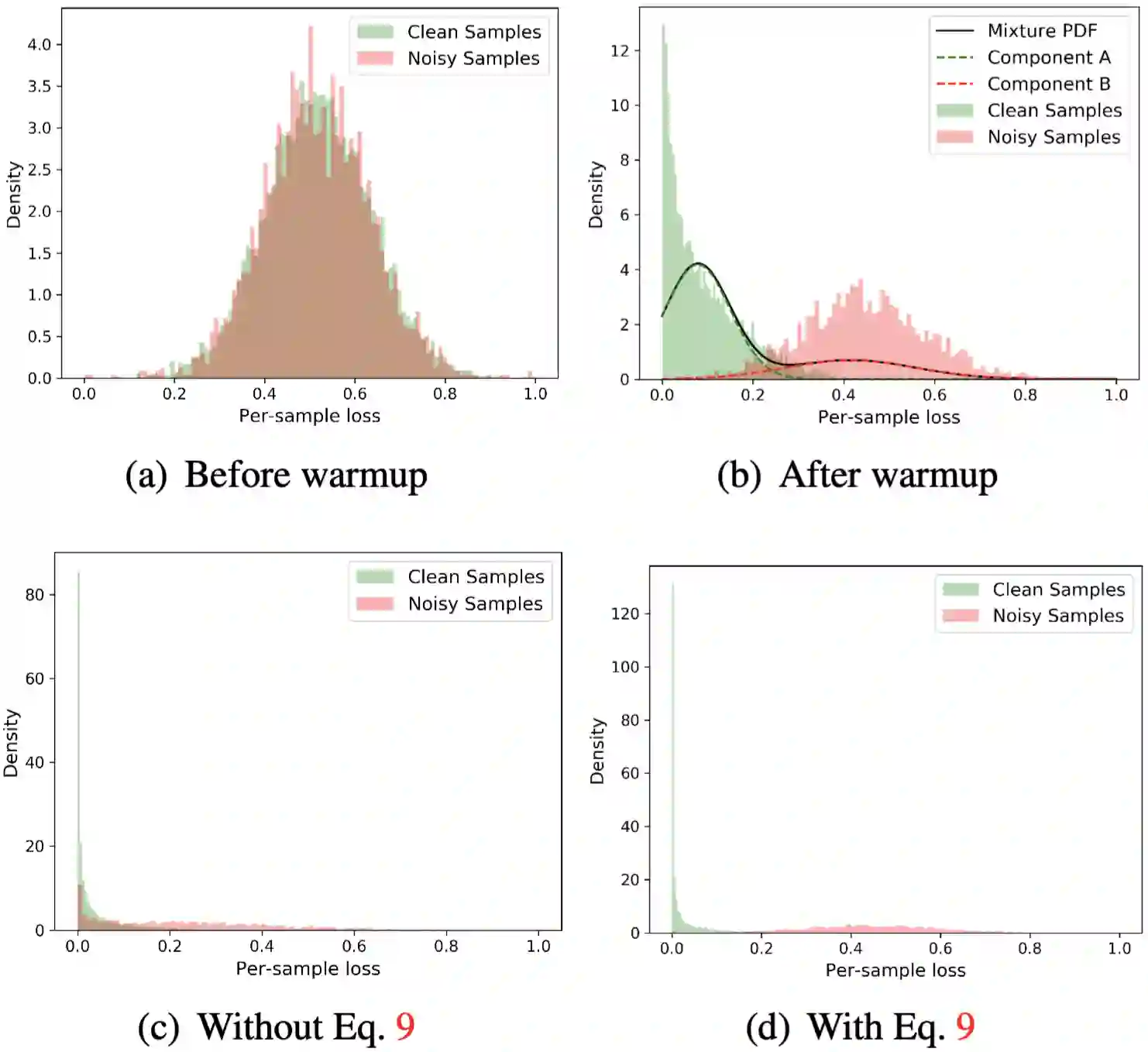 为优化GMM,采用了期望最大化算法(EM)。基于记忆效应。将均值较低(即损失较小)的成分作为干净数据集,另一个作为噪声数据集集,同时将每个样本属于较小成分的后验概率作为第i个样本的干净置信度,计算如下: