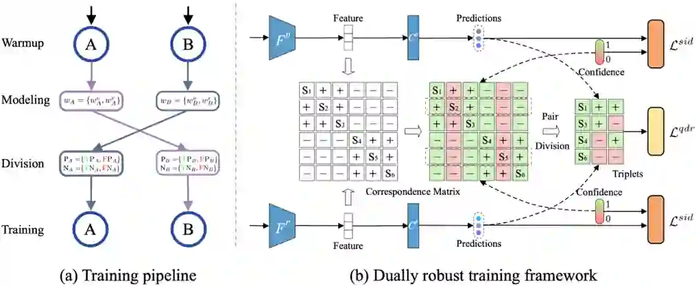 背景:给定行人的可见光(或红外)相机照片,跨模态行人重识别(VI-ReID)旨在从数据库匹配出该行人的红外(或可见光)照片。一个流行的VI-ReID范式是利用行人标注提高不同行人间判别性,同时构建跨模态正负样本对并进行跨模态学习以缩减模态间鸿沟。由于红外模态下的识别度较差,行人训练数据中将不可避免地存在一些噪声标注(Noisy Annotation,NA)。我们发现,这些NA将进一步导致所构建的跨模态正负样本呈现噪声关联(Noisy Correspondence,NC [1-2])。换言之,跨可见光-红外行人重标识任务将面临孪生噪声标签(Twin Noisy Labels,TNL)挑战。针对该挑战,论文[3]提出了一种新的鲁棒VI-ReID方法,名为双重鲁棒训练器(DuAlly Robust Training,DART),其首先利用神经网络的记忆效用来计算标注的置信度。基于置信度,DART将跨模态正负样本分为不同子集并进一步校正其中的关联。最后,DART利用所设计的双重鲁棒损失函数来实现对孪生噪声标签鲁棒的跨模态行人重识别。需要说明的是,过去多年,针对分类任务中“噪声标注”问题(Learning with Noisy Labels)已有许多卓有成效的解决方案。然而,过去多年的大多研究主要针对单模态的图像分类任务,忽视了跨模态任务中潜在的错误关联问题(Learning with Noisy Correspondence)[1-2],更没有实际需求出发,对噪声标注伴生噪声关联的孪生噪声标签现象的揭示和研究。