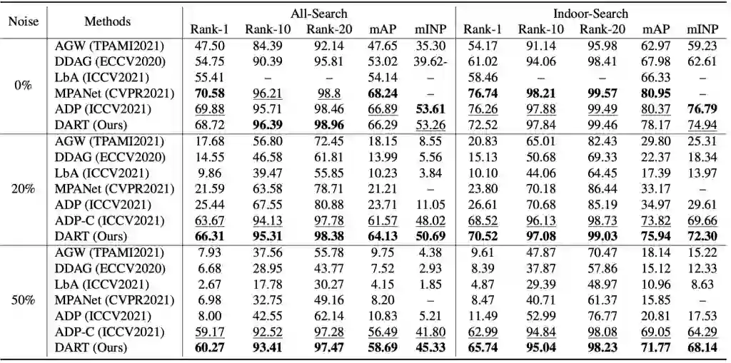 实验:本文在VI-ReID的两个数据集上进行了实验,包括:SYSU-MM01和RegDB。为验证DART的鲁棒性和有效性,论文分别在噪声率为0%,20%和50%下和包括ADP在内的目前SOTA方法进行对比。由于目前跨模态行人重识别方法无法标签含噪数据,为保证公平性,对比方法中包含了ADP-C,其抛弃了含噪数据,只在干净数据上训练。以下展示部分实验结果,更多结果和分析详见原文。