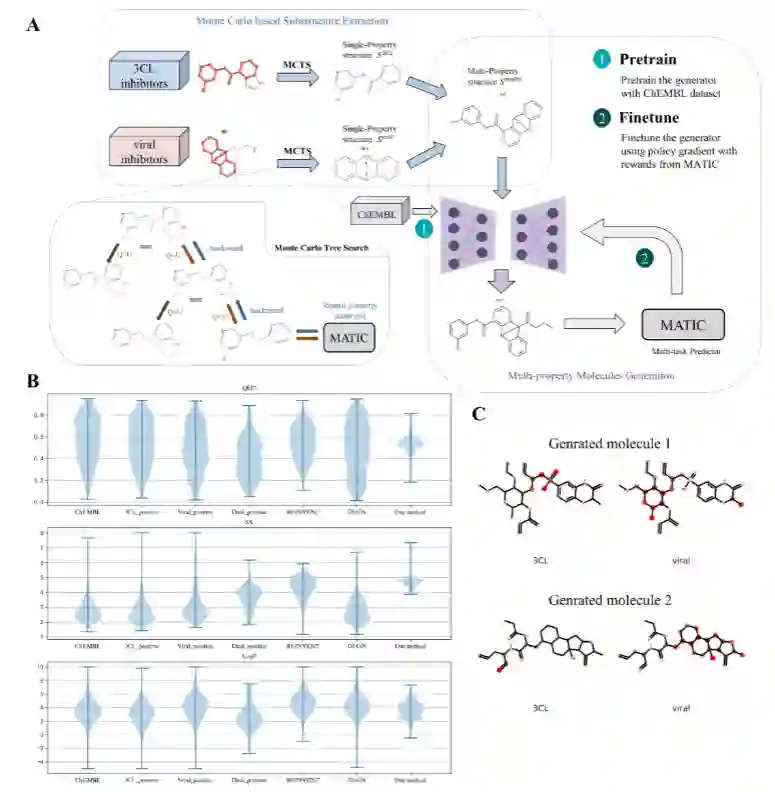 针对SARS-CoV-2的药物开发,作者提出一种框架来缩小基于靶标和基于细胞的药物发现之间的差异。如图 1 所示,框架包括两部分:预测器和生成器。预测器是一种基于图的多任务学习模型(MATIC),用于同时预测化合物的体外SARS-CoV-2 3CLpro抑制和体内抗病毒作用。生成模型建立于MATIC模型基础上,联合基于蒙特卡洛算法的强化学习模型生成具有靶点抑制和细胞活性特性的新型化合物。