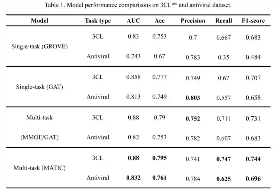 如表1所示,MATIC 在多数指标上都取得了最佳性能。高召回值表明 MATIC发现了更多的真阳性化合物,这归因于来自不同任务的相关信息可以更好地共享和使用。例如,许多化合物仅显示出3CL抑制作用,但实际上具有抗病毒活性。由于标签缺失而无法用于抗病毒单任务训练,但它们可能在多任务模型的两个任务中都有效且交叉。因此,MATIC 不仅可用于3CL抑制化合物和细胞活性化合物的识别,还可用于目标反褶积。此外,MATIC 取得了比 MMOE 更好的性能,这表明将特定信息和共享信息分开可以确保跨任务的知识转移并保证任务特定特征的完整性。