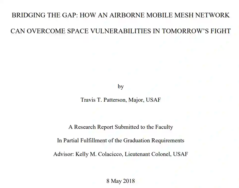 美国空军对太空能力的严重依赖,使其在不久的将来很容易受到潜在的削弱性不对称多域攻击。虽然空军领导人已经意识到保持太空领域主导地位的重要性,但他们在未来实现弹性和可生存系统的目标并非唾手可得。同行竞争者和潜在对手已经拥有多项作战和开发能力,这使美国的关键太空资产在成本交换战中处于劣势。空军的高空 ISR 平台最初托管了一个机载移动网格网络,这是降低许多此类风险的一种选择。