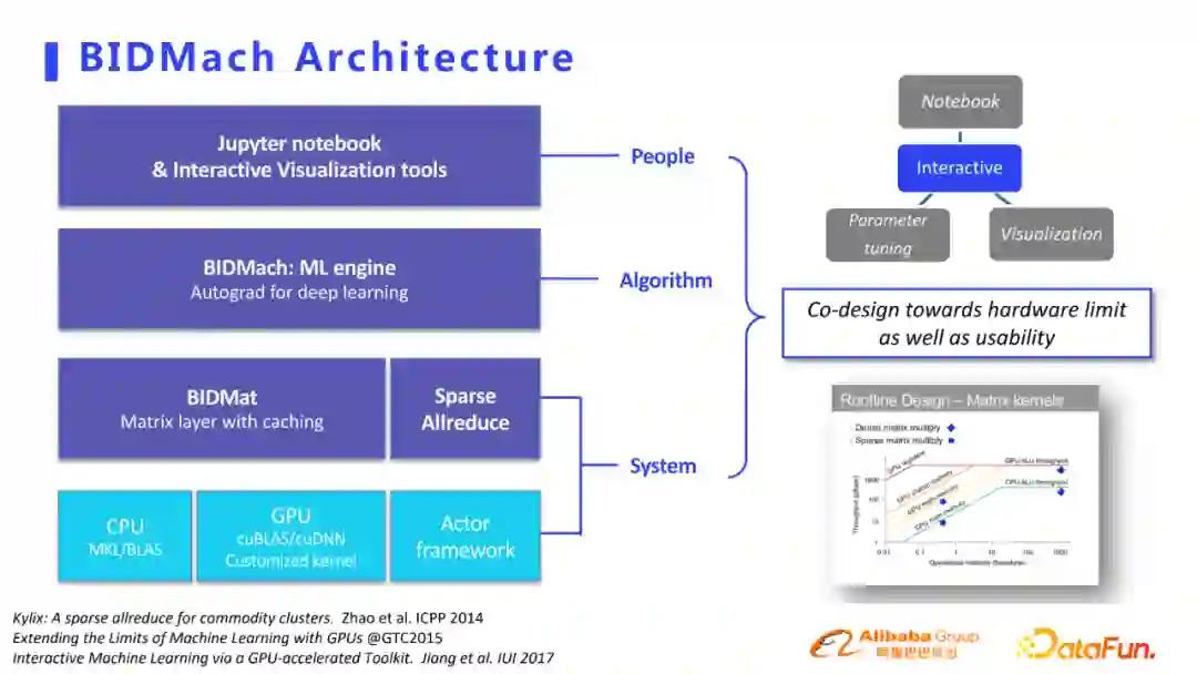 BIDMach的整体设计分三层,下层关注于底层硬件的性能并统一封装为矩阵运算和Actor间的通信操作;中间层是各种机器学习算法的计算图封装,而最上层则是面向用户设计的交互式机器学习工具。此外,BIDMach以从上到下的整体Co-design为核心设计思想,在性能方面用Roofline Model优化到硬件的极限,在可用性方面需要有交互和可视化呈现结果以及提供交互式的调参等功能。而框架的语言统一和架构精简,让我们从上到下做到整体协同优化变得格外容易。