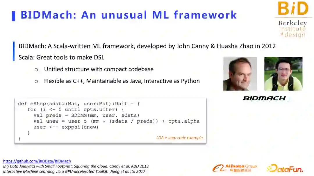 BIDMach是2012年在伯克利BID实验室研发的一个开源机器学习框架。 (参见https://github.com/BIDData/BIDMach)不同于一般的主流框架,它除了最底层用JNI调用CUDA/MKL之外,其前后端都统一到了Scala语言。诸如内存管理、计算管理、图计算等都是用Scala写的,是一个简洁且清晰统一的代码框架。 之所以选用Scala,是因为其有很新的语言特性,它可以像C++一样灵活,像Java一样具有很强的可维护性,也同时具有像Python一样的交互编程特性。 正如下面的一段代码一样,通过Scala的语法糖,可以定制出类Matlab的编程语法,可读性非常强。