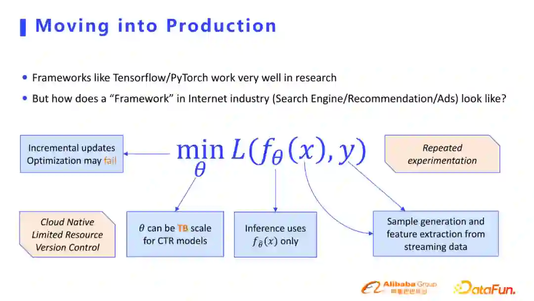 但是到了工业界,实际的机器学习问题远不止这么简单,我们要重新思考一下框架的职责。框架是只需要专注于做损失函数优化就可以呢?还是会有很多其它事情也要去负责呢?比如图中所示的x、y样本数据本身的生成就是一个很大的问题:比如样例生成或者特征萃取。而且在互联网应用中,我们往往需要从流式的数据流中实时地完成x、y的生成。