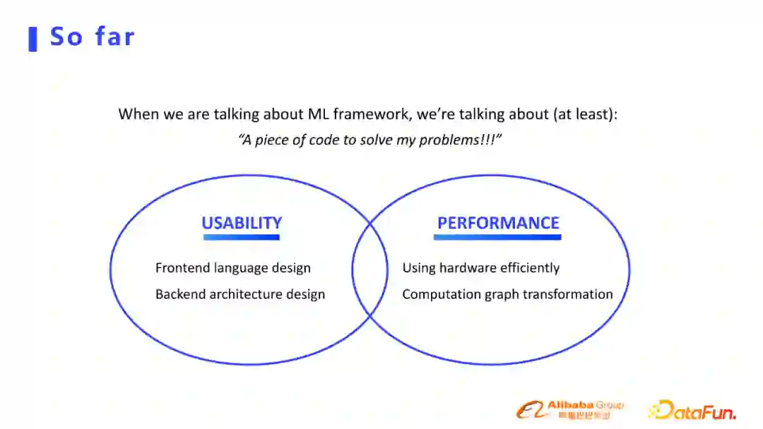 首先我们可以从可用性,即考虑单个程序员的编程效率; 第二就是机器性能效率,即如何去做编译优化,如何做适配,如何去做图改写,如何去做调度分配等; 第三是组织效率,即考虑这个框架生产化功能是否完备,是否能提供较好的可扩展性以支持工业界的大规模生产化协同工作; 最后是生态层面,也就是要考虑算法的演化路径以及未来几年整个算法的趋势。框架是否能让算法不断尝试新想法,优化社区的整体效率。